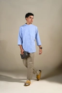 - Collarless Neck featuring ¾ sleeves with open cuff